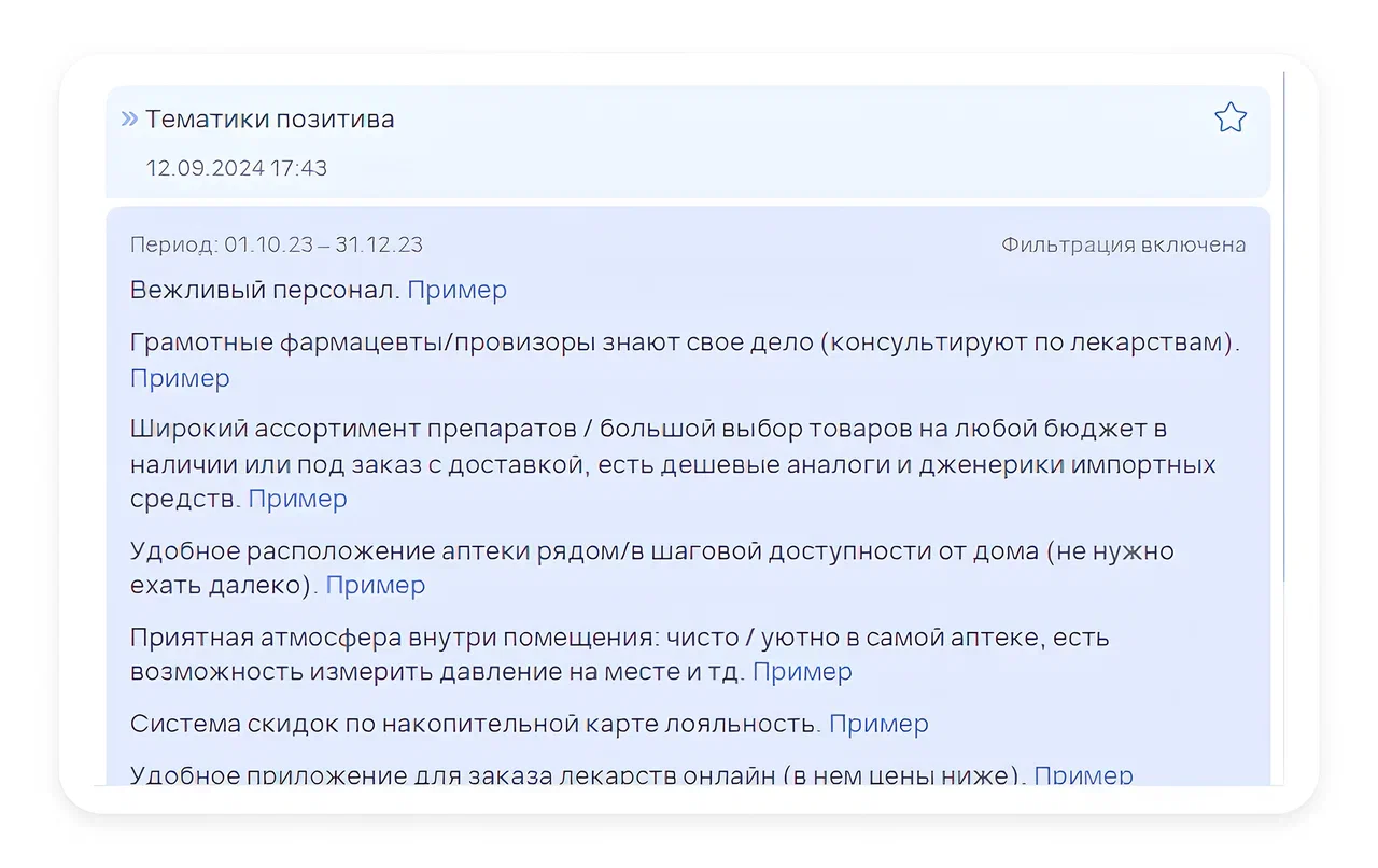 Параллельно каждый день формируем отчет о тематиках новых упоминаний. Так, люди в позитивном ключе отмечали вежливый персонал, грамотных провизоров, систему скидок и большой выбор лекарств. В негативном — работу приложения. Большая часть сообщений посвящена сервису. Всё это точки роста для проработки репутации.