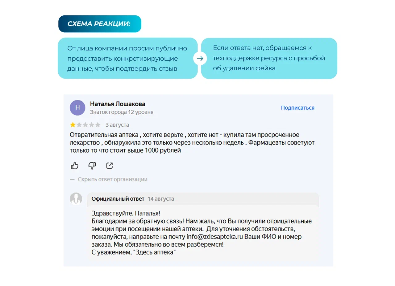Точечной, но от этого не менее значимой стала задача по удалению фейков. Автоматизированный мониторинг позволяет сразу выявить пустые отклики — анонимные, оскорбительные, не соответствующие реальности. Для них один ответ — удаление.