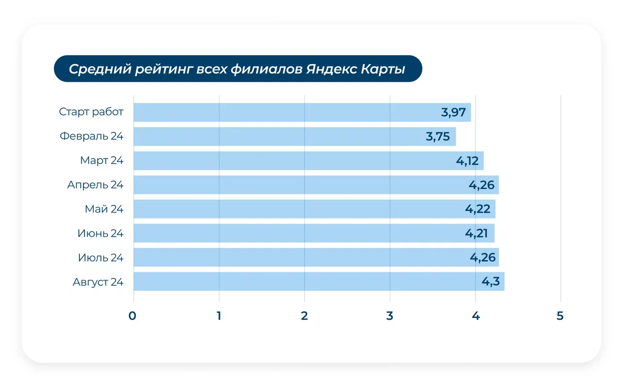 - Повысили средний рейтинг компании на Яндекс Картах до 4,3 баллов.