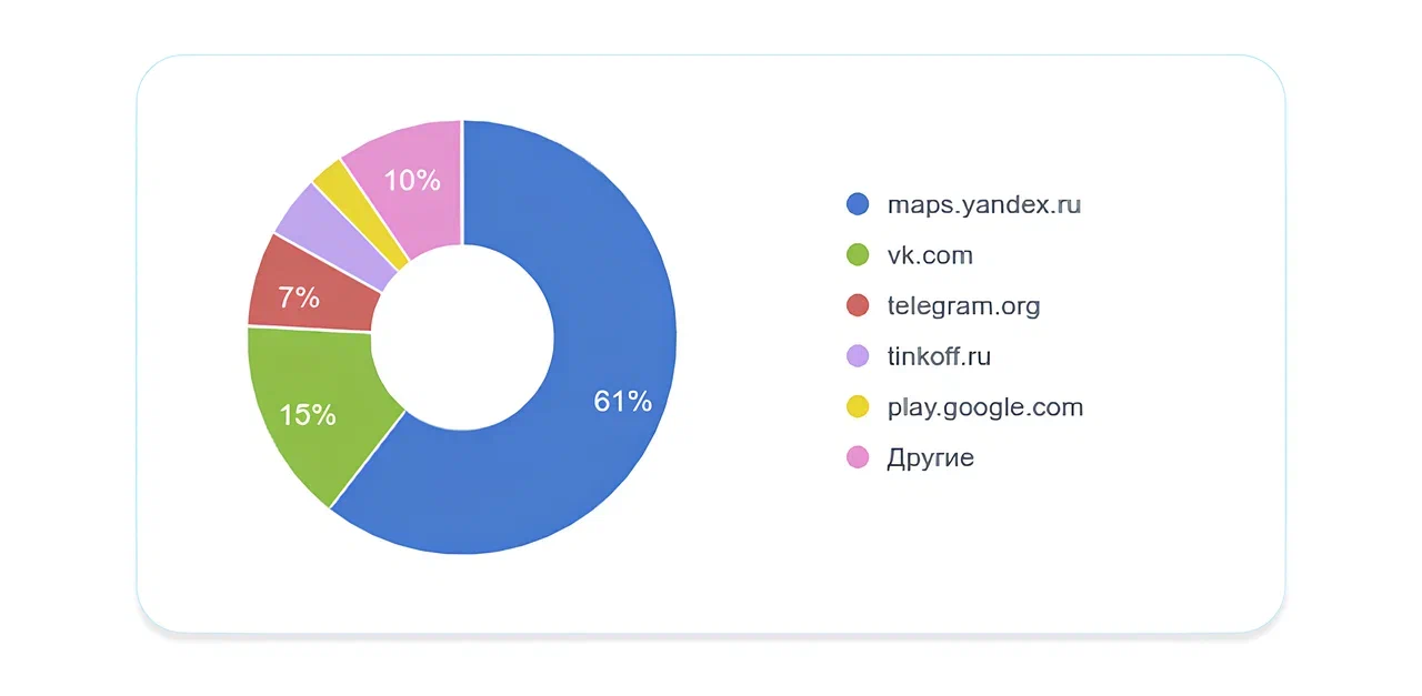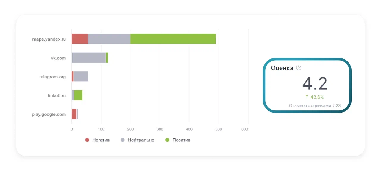 61% упоминаний поступает на “Яндекс Карты”. Выделяем площадку как приоритетный ресурс для работы с официальными ответами. Общая доля позитива — 41%, негатива — 12%. Негативные сообщения также сконцентрированы на “Яндекс Картах”. Средняя оценка — 4,2 балла. Поэтому мы считаем его наиболее важным ресурсом для работы с негативом. Налаживаем диалог с теми, кто высказывает недовольство, чтобы повысить лояльность аудитории.