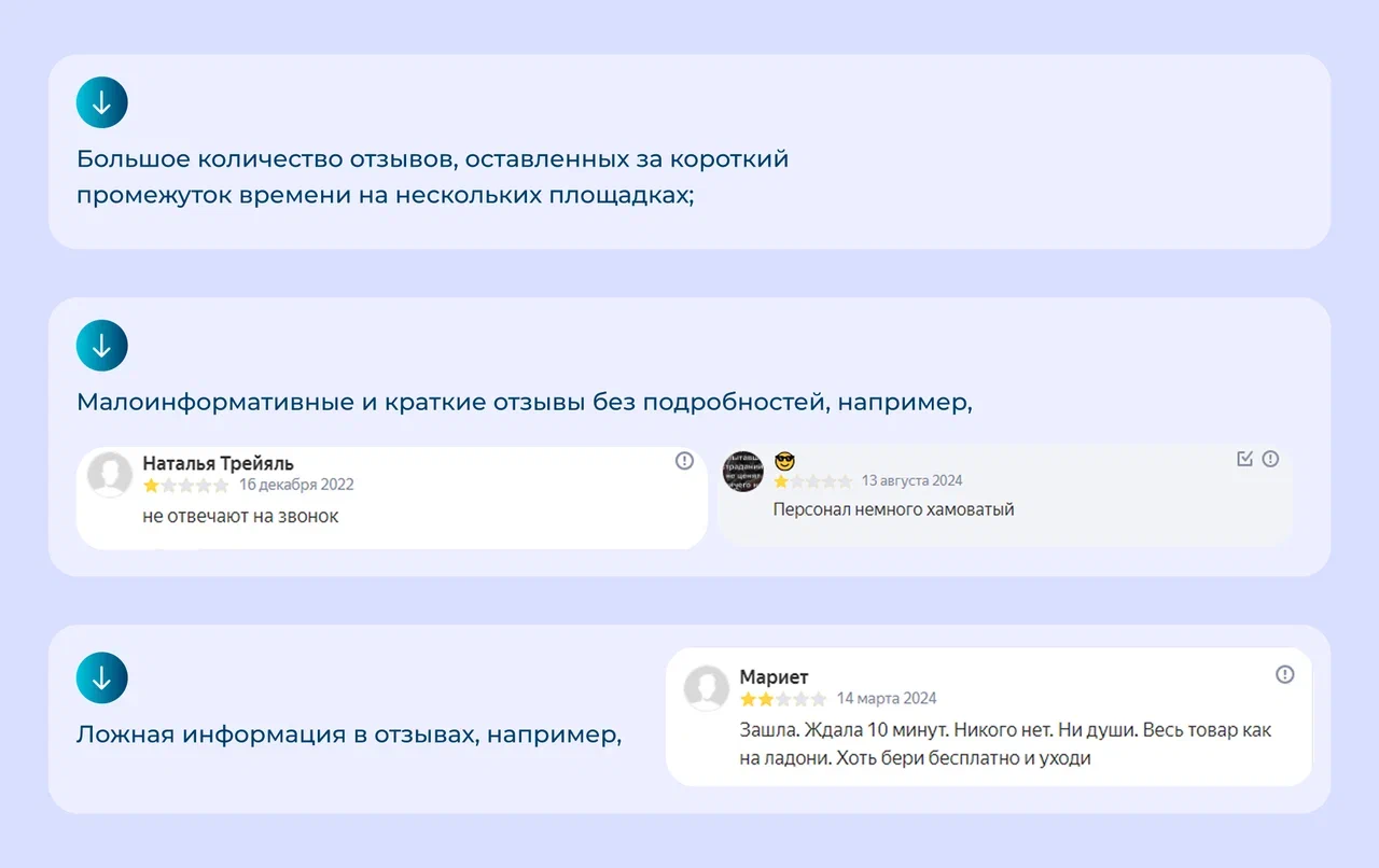 Мы создали уникальный алгоритм на основе ИИ, который автоматически определяет признаки фейкового негатива в отзывах. Он помог выявить объекты для последующего удаления: