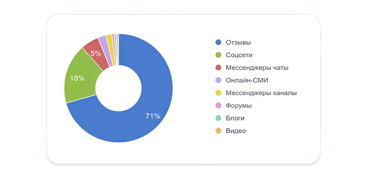 Анализ источников сразу выявил интересный инсайт. Ключевой формат обратной связи от клиентов — отзывы. На них приходится 71% упоминаний. Соответственно, предстояло работать не с комментариями и вопросами, а напрямую с реальным клиентским опытом.