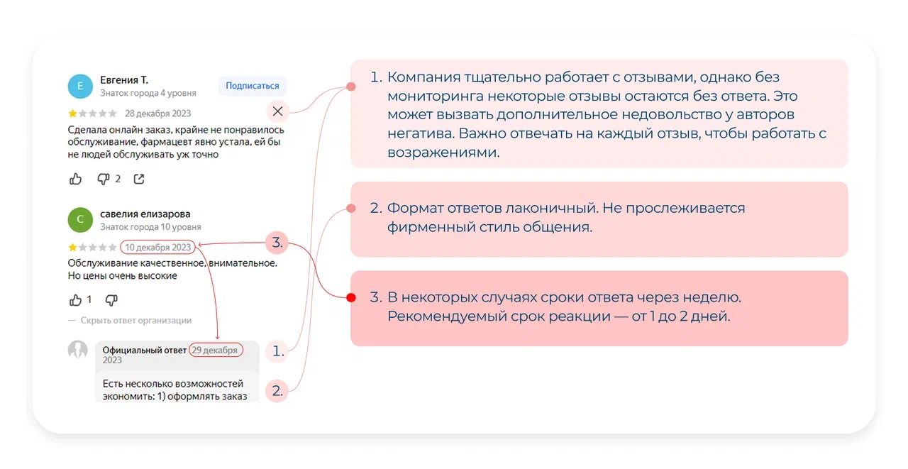 В отдельное направление выделили анализ коммуникации компании. Упоминаний сотни и тысячи. Выяснили, что без мониторинга некоторые отзывы остаются без ответа. Это может вызвать дополнительное недовольство у авторов негатива. Недовольный клиент, оставшийся без ответа, скорее всего, больше заказывать лекарства на этой площадке не будет. Так мы теряем покупателей.