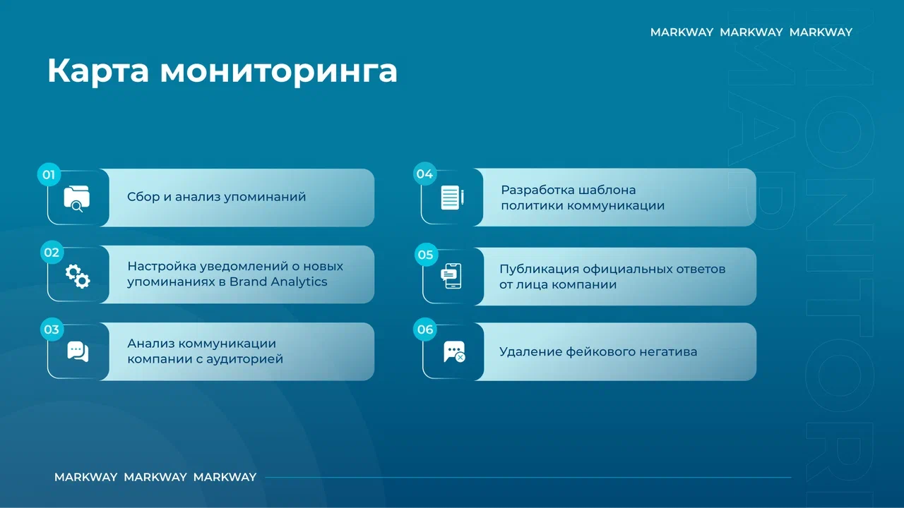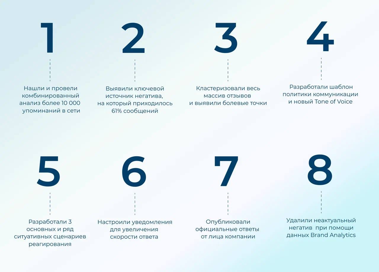 Вместе с клиентом разработали алгоритм реагирования и создали шаблон политики коммуникации. Обеспечили коммуникацию с авторами отзывов через официальные ответы представителя компании.