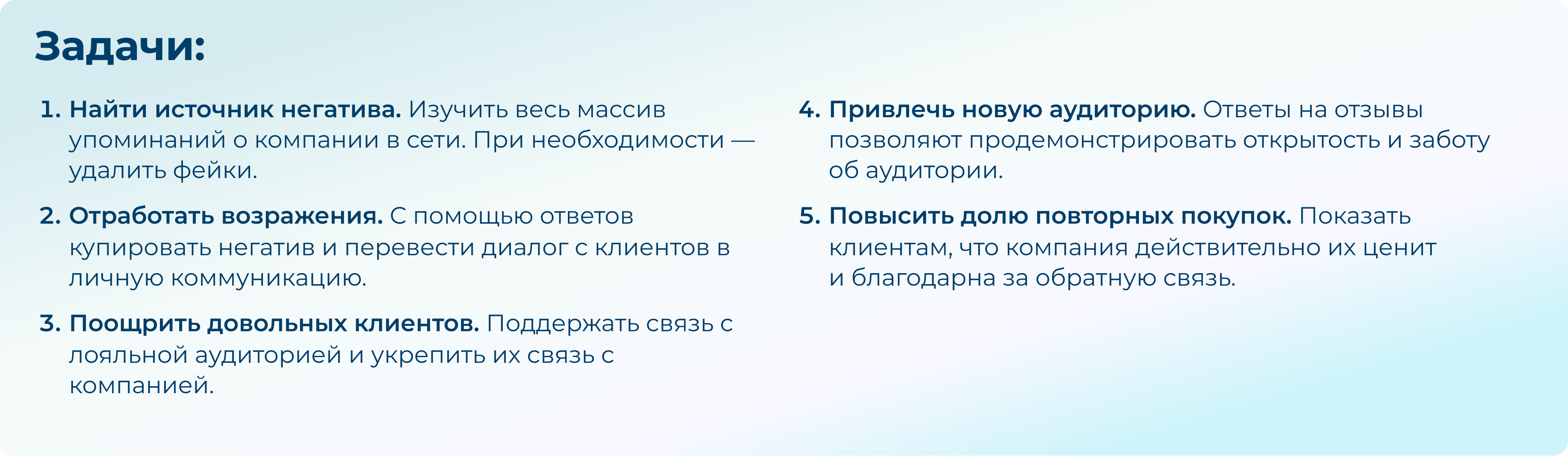 Ключевой целью проекта было собрать и обработать упоминания в сети, проанализировать мнение клиентов, сформировать политику коммуникации, провести работу с отзывами и повысить лояльность.