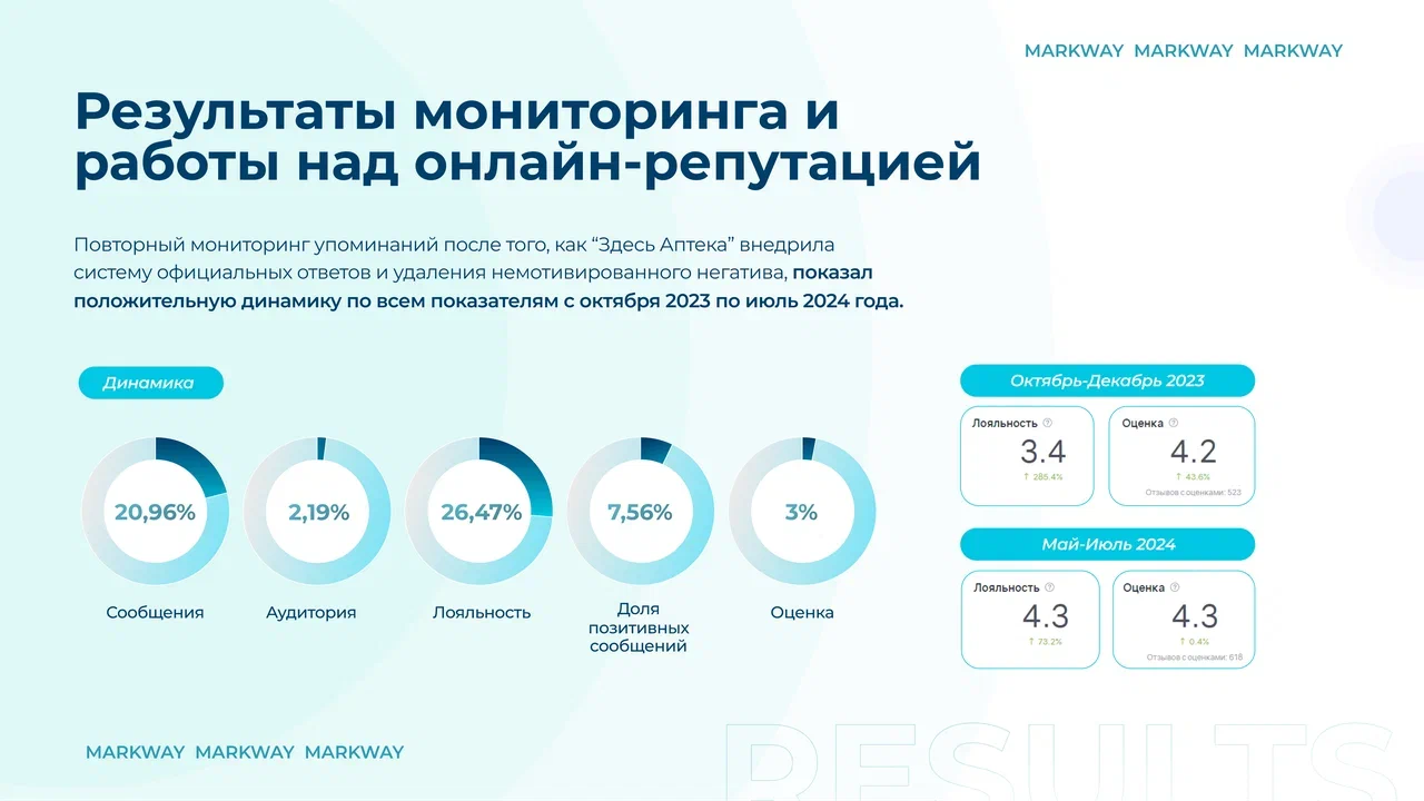 ООО «Здравсерис» выражает благодарность Markway за вклад в повышение лояльности наших клиентов к бренду «Здесь аптека», а также за рост положительной репутации нашей компании.