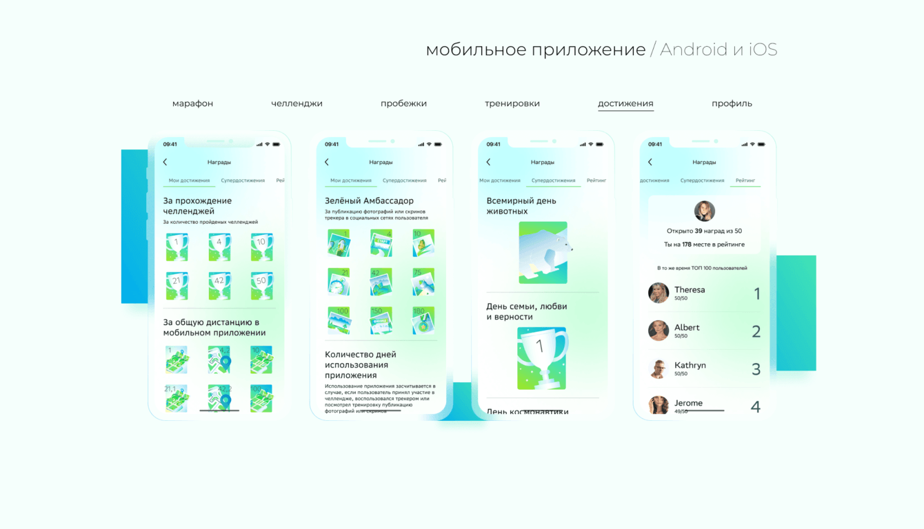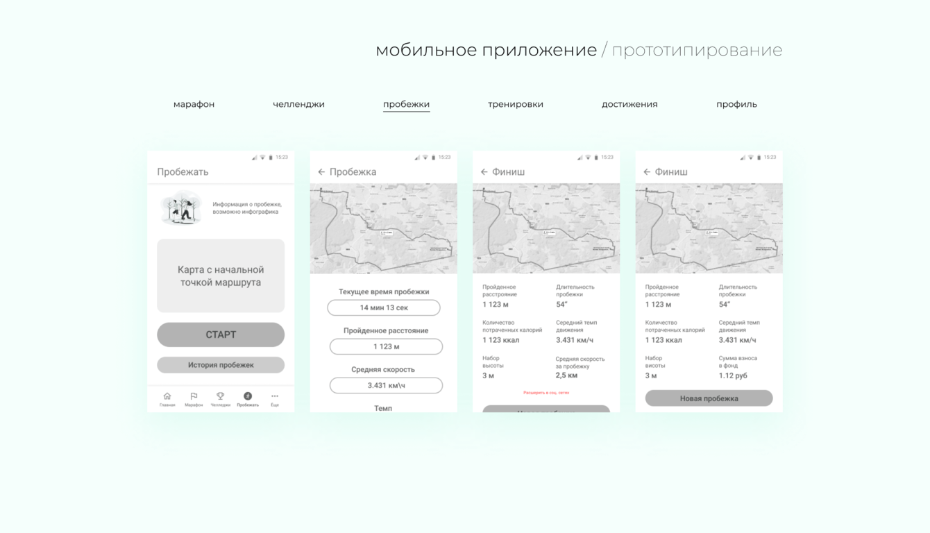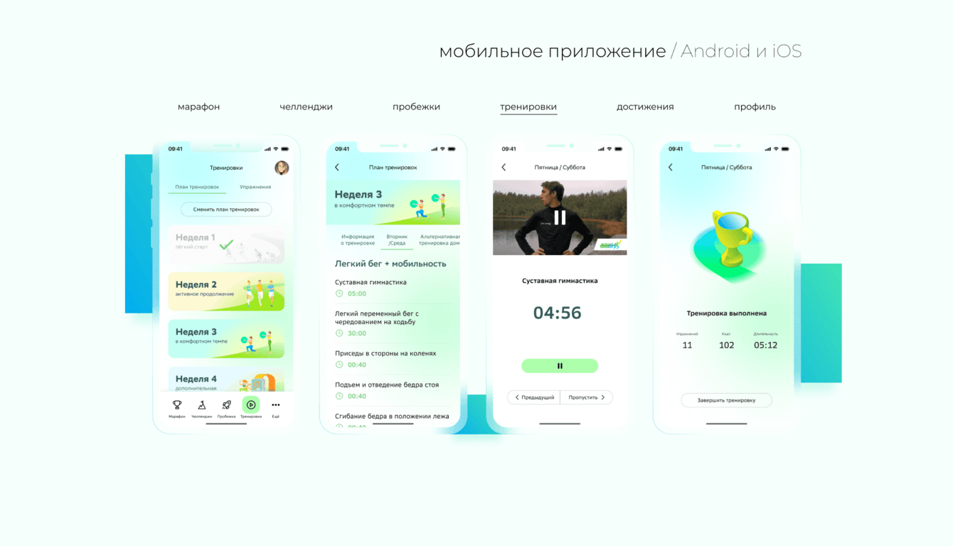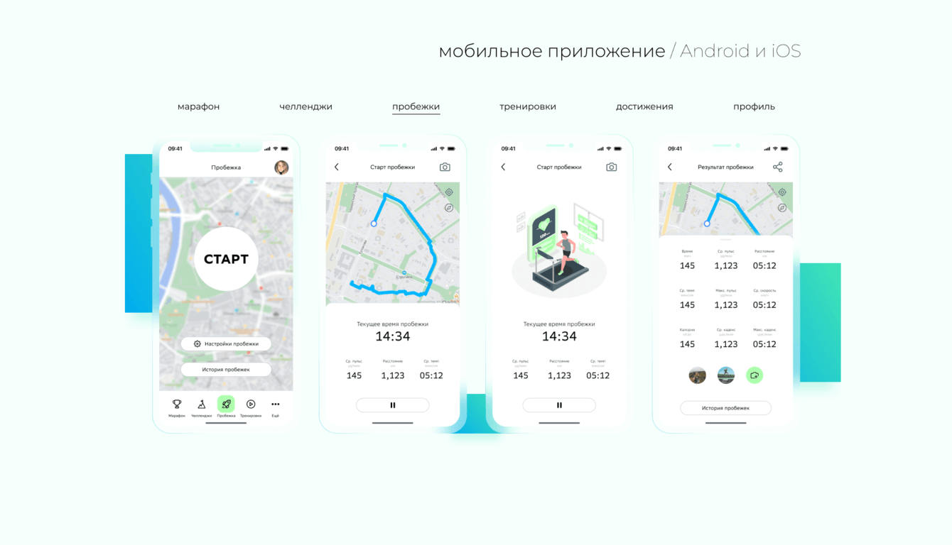 -Разработка мобильного приложения с функцией трекера маршрута для пробежек, тренировками и рецептами, системой челленджей и наград от партнёров.