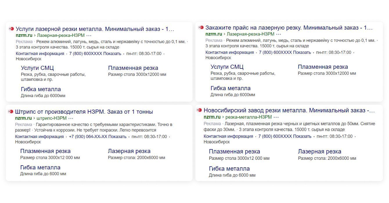 Сформировав показатели качественного лида — стоимость, минимальный объем заказа, с какими типа металла работаем — мы корректировали рекламную кампанию: исключали нецелевые ключи, корректировали объявления и перераспределяли бюджет на эффективные запросы.