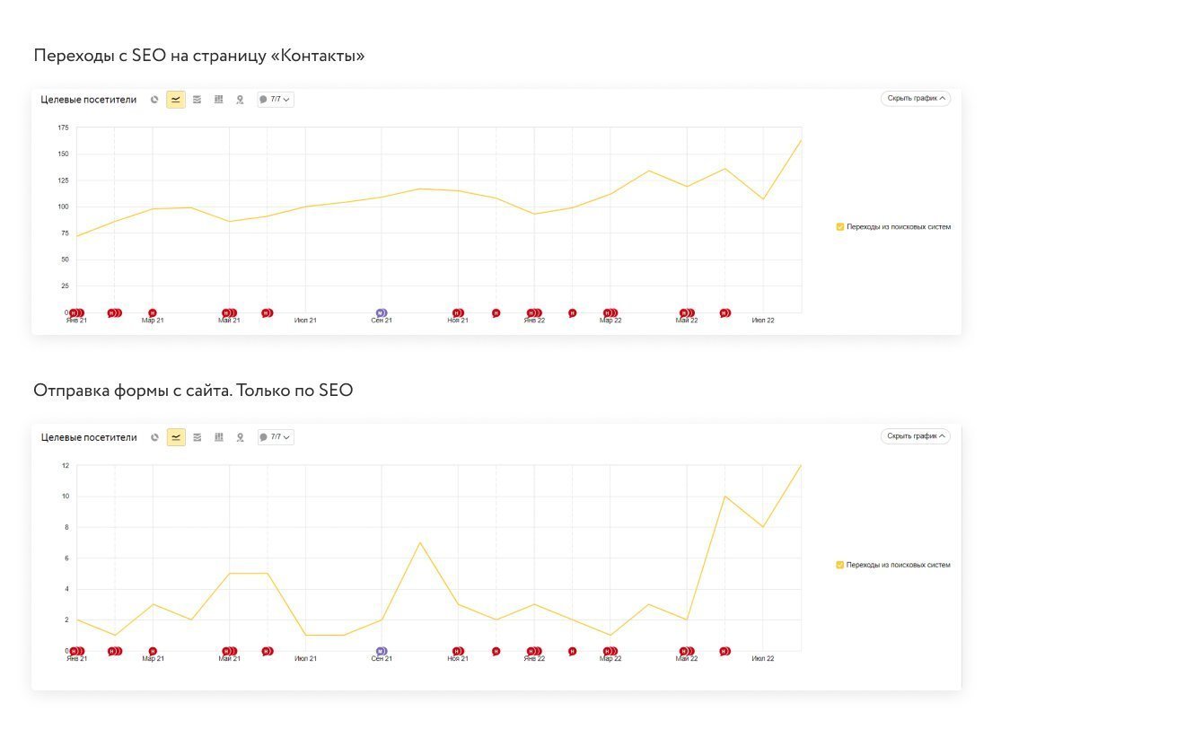Спустя месяц ситуация нормализовалась: увеличились глубина просмотра и время посещения сайта. Количество заявок вернулось на прежний уровень, а после, за пару месяцев, выросло вместе с качеством.