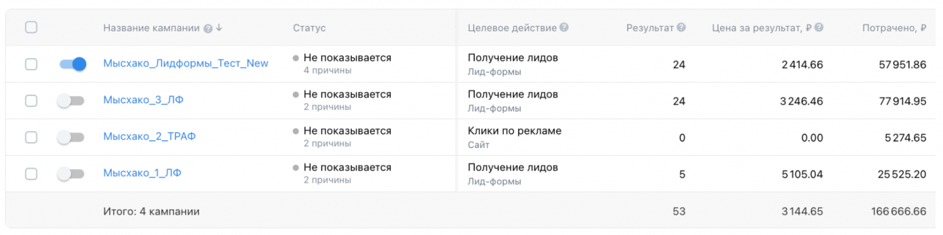 По опыту в сфере недвижимости лучше работает формат именно лидформ, поэтому мы создали отдельную кампанию и сконцентрировались только на ней. Показывать точные примеры объявлений неэтично, поэтому покажем только общую статистику в сравнении: "Наша рекламная кампания/рекламные кампании клиента".
