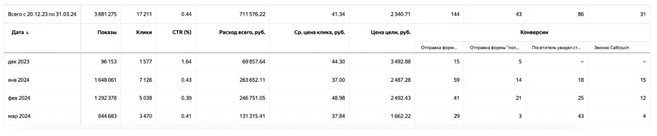 Итог: За первые 10 дней работы мы получили 20 заявок (старт проекта был 20ого декабря) и в сравнении с прошлым подрядчиком клиент был очень доволен. За 2 месяца мы улучшили свои результаты на 52% и снизили стоимость лида с 3500₽ до 1670₽ (Вставить скриншот 1) Хотите увеличить продажи с помощью контекстной рекламы? Оставляйте заявку на этой странице, обсудим детали и придумаем как сможем вам помочь.