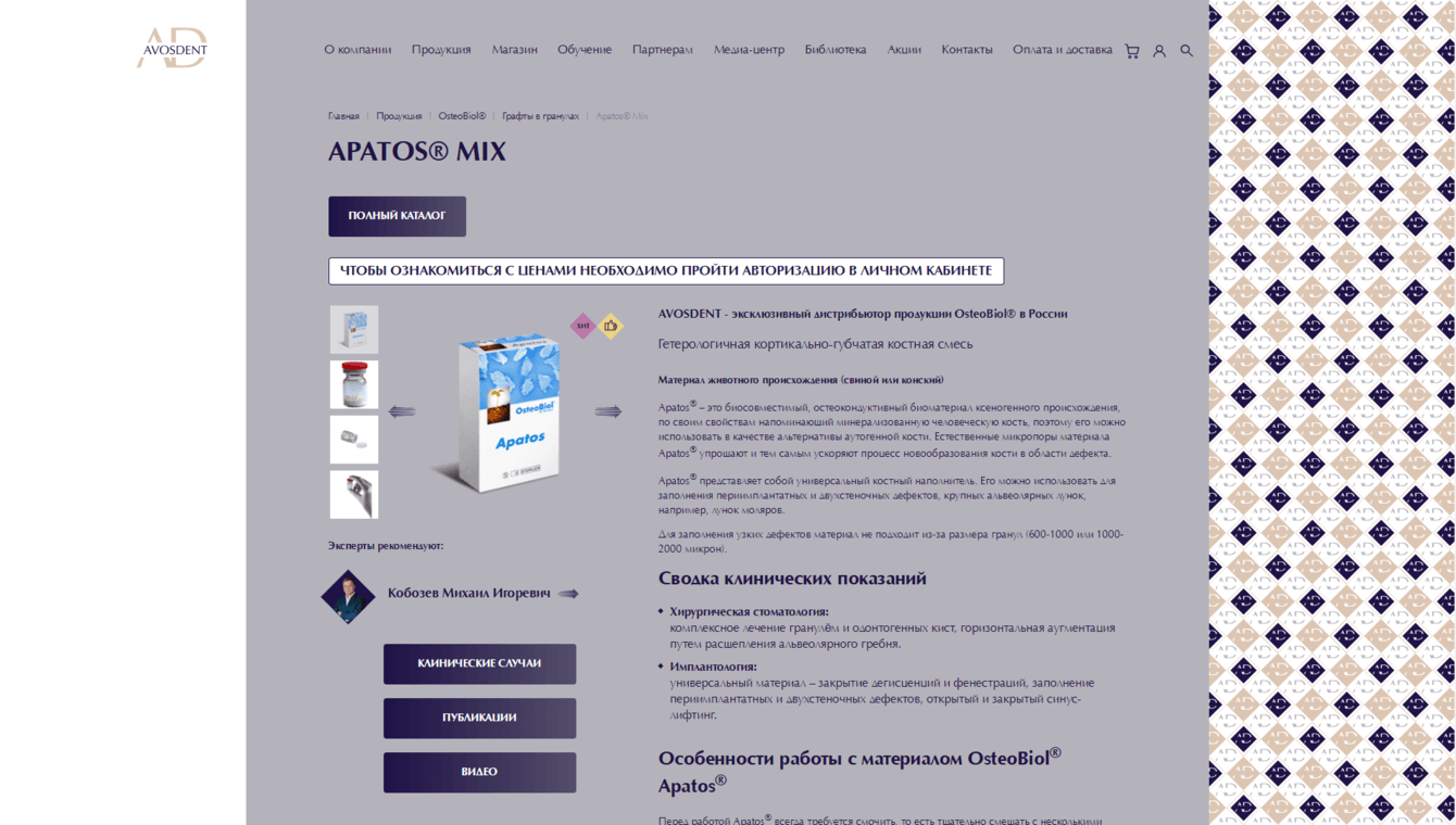 Ключевое требование клиента — новая концепция сайта — больше говорить о бренде, компании и ее деятельности. Продажа стоматологических материалов должна была стать только одним из аспектов, но не основным смыслом сайта. Ведь кроме этого AVOSDENT проводит профессиональное обучение, имеет большую библиотеку экспертных материалов, анонсирует международные отраслевые мероприятия и организует свои собственные.