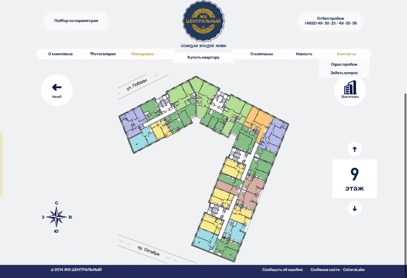 Сайт разрабатывался для ЖК «Центральный» с целью информирования жителей Ярославля и области о новом жилом комплексе. Самым важным для Заказчика было наглядное представление планировок квартир на сайте и online-трансляция со стройки.