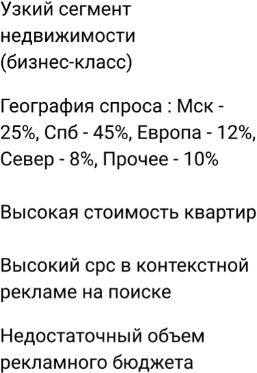 Но это жилая недвижимость бизнес-класса с достаточно дорогостоящими объектами, что не способствовало росту продаж. И, чтобы исправить ситуацию, заказчик поставил перед нами задачу: