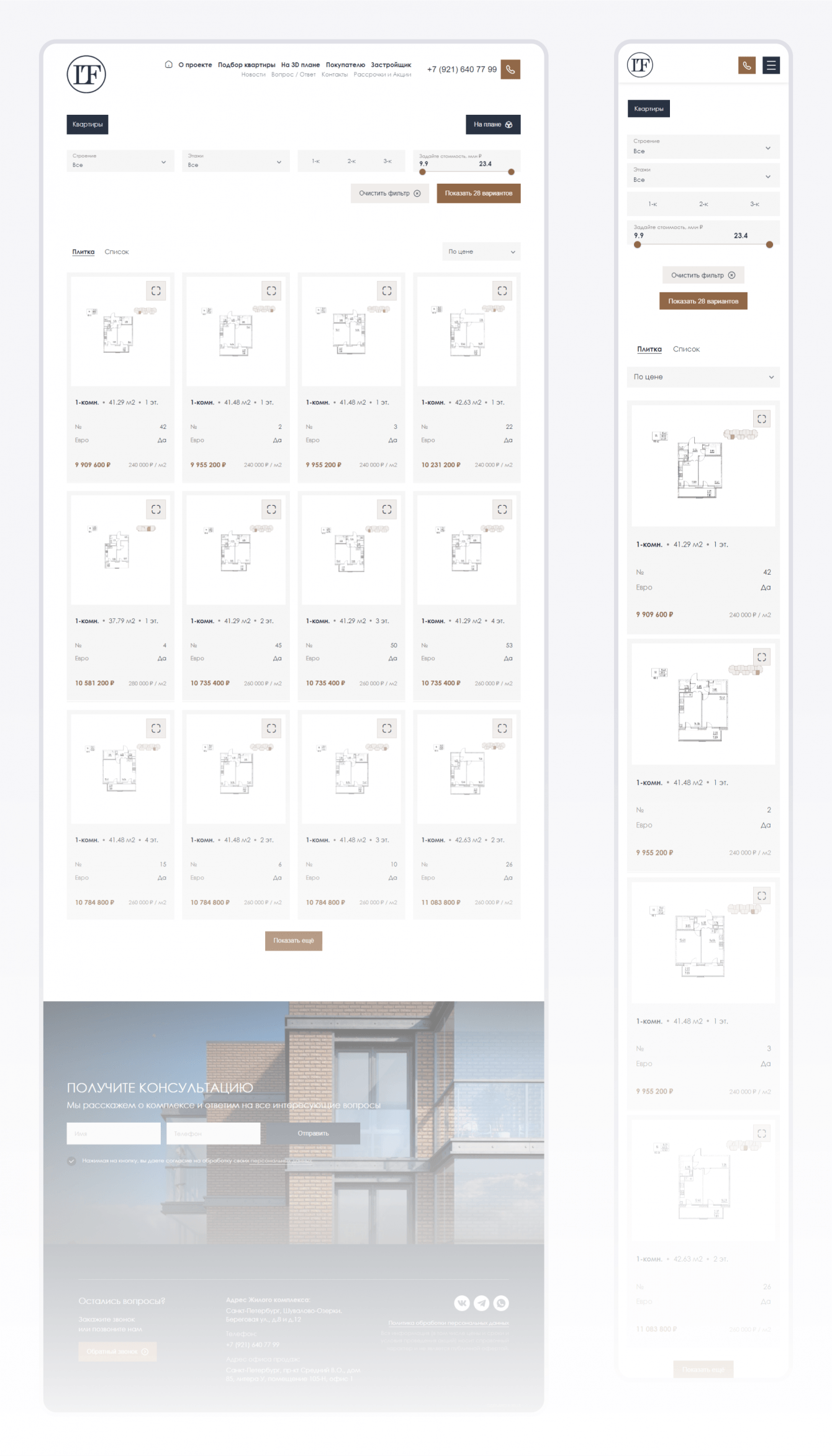 На сайте реализовано 2 варианта подбора квартиры: подбор по параметрам и подбор на 3D плане. Подбор по параметрам выдает результат в 2-х форматах: в виде плитки и в виде списка. Данные о количестве найденных вариантов обновляются каждый раз при вводе нового значения от пользователя.