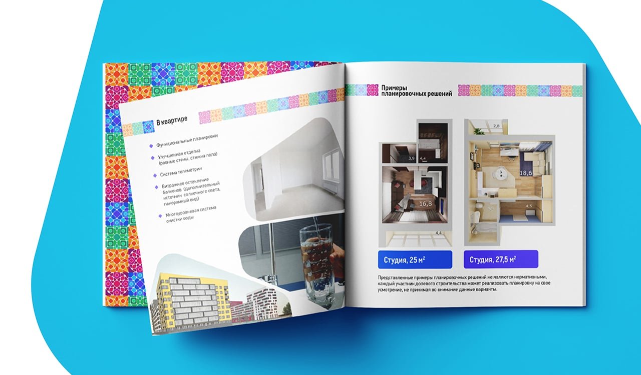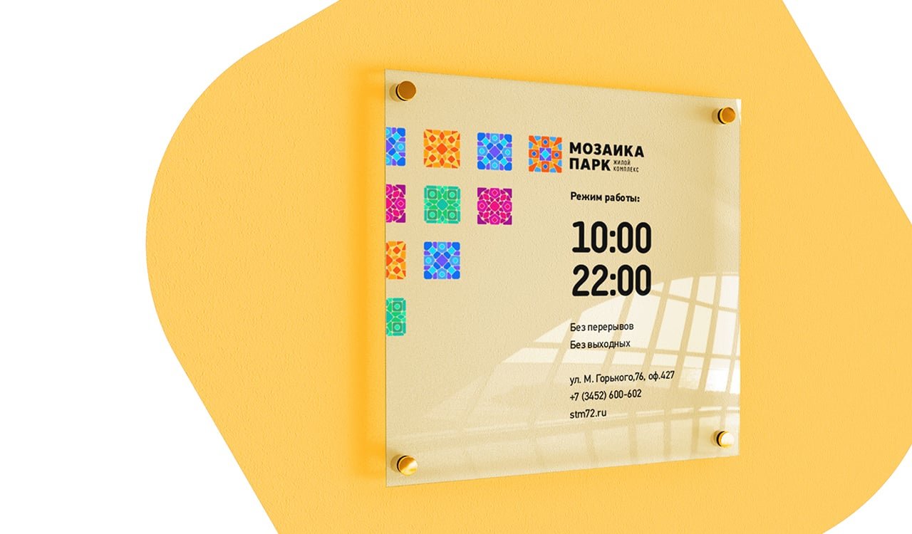 Идея нашла выражение в фирменном стиле. Яркая графика базируется на насыщенных цветах и абстрактных узорах. Логотип символизирует мозаичную плитку и витраж, олицетворяет эмоциональность и творческую деятельность. Внутри данной системы есть несколько подвариантов логотипа со своей формой, цветом и структурой, которые могут использоваться для различных направлений или активностей на территории жилого комплекса. Для внутренней навигации были разработаны фирменные иконки, а также был создан паттерн, который может применяться на множестве носителей.