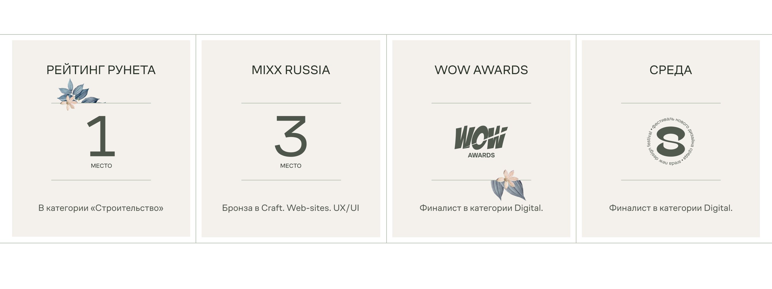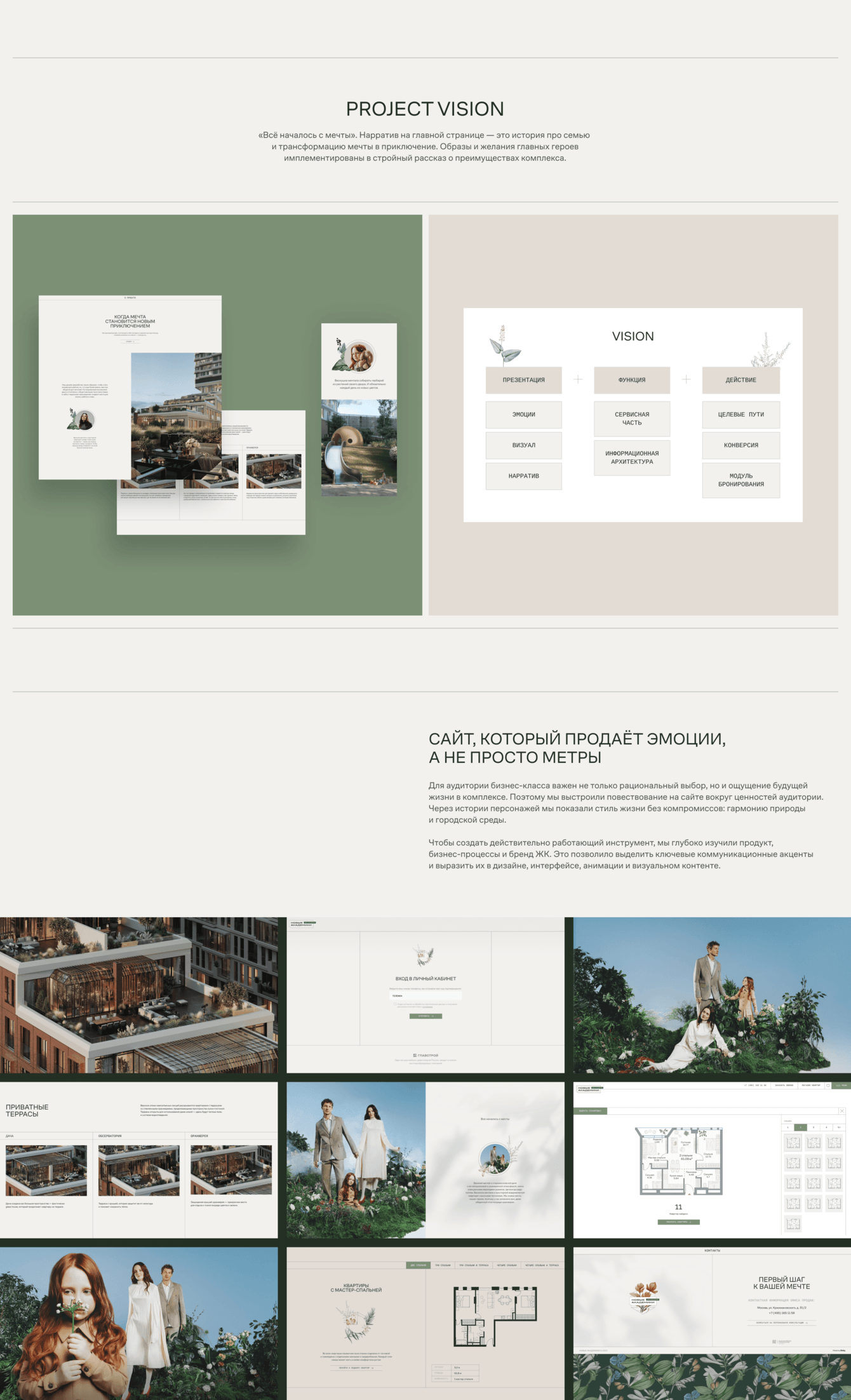 Мы изучили сайты ЖК бизнес- и премиум-класса и заметили, что многие из них перегружены сложной анимацией. Это может выглядеть эффектно, но часто мешает восприятию информации. В нашем проекте мы сделали акцент на спокойной и интеллигентной подаче, которая отражает академичность бренда и соответствует ожиданиям целевой аудитории.