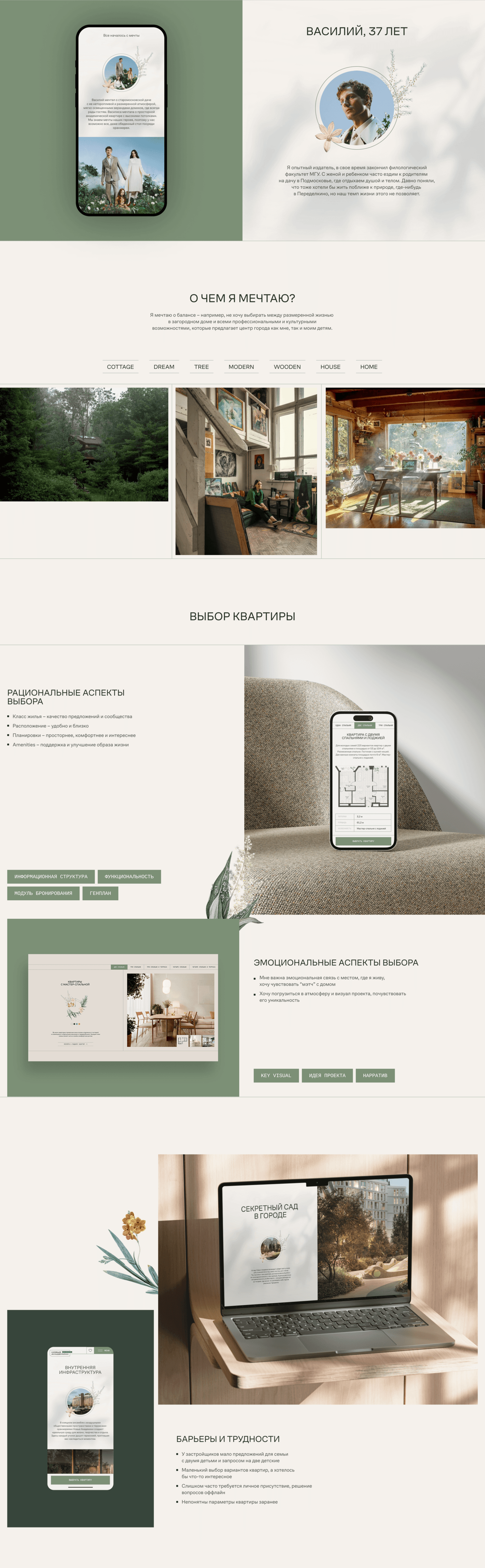 Мы детально изучили целевую аудиторию: разобрали воронку покупки жилья, определили, на каком этапе пользователи приходят на сайт ЖК, какие у них приоритеты, мотивы и ожидания. Затем углубились в портрет потенциального жителя, его образ жизни, ценности и ключевые потребности.