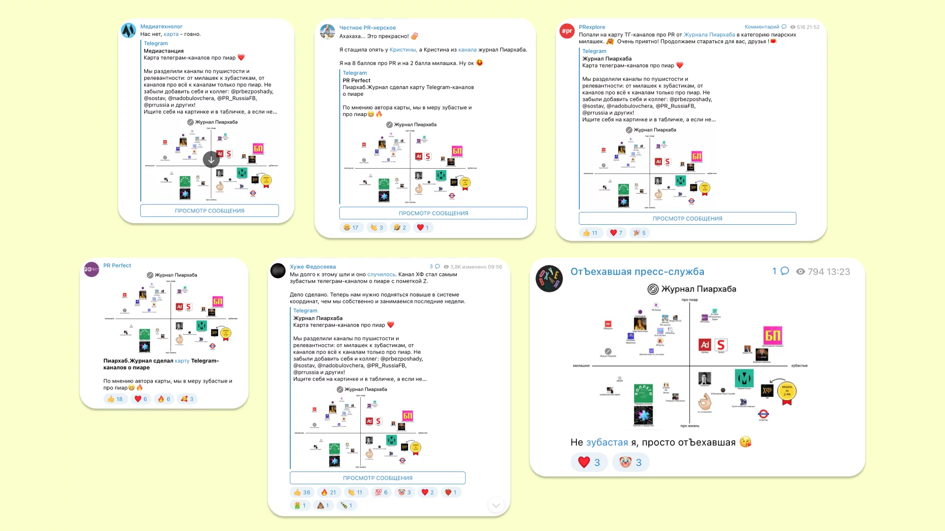 Чтобы нас заметили и зарепостили коллеги, мы сделали карту с каналами про пиар. Делили по двум критериям: пушистые или зубастые, больше о пиаре или о жизни.