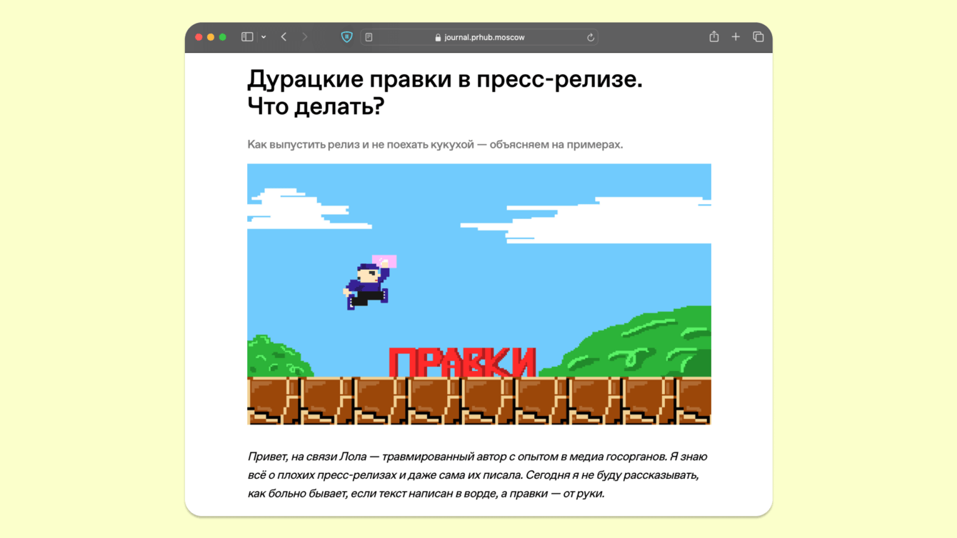 Мы долго брейнштормили, как должно выглядеть бренд‑медиа для пиарщиков, и решили сделать сайт в пикселях: он смотрится оригинально, мило и, главное, не стоково.