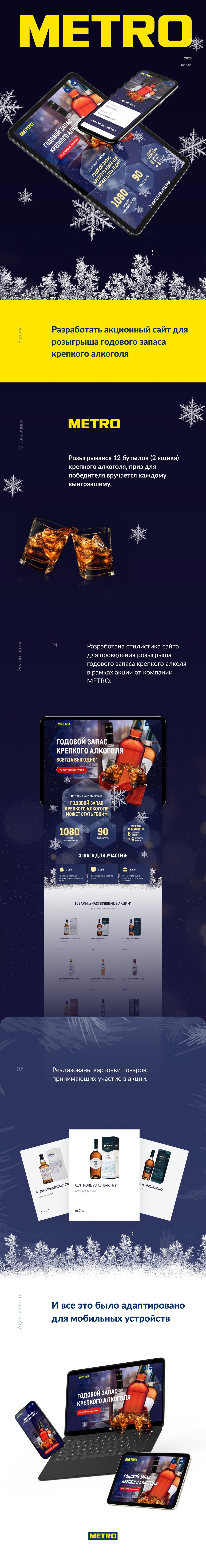 - Разработана стилистика сайта для проведения розыгрыша годового запаса крепкого алкоголя в рамках акции от компании METRO.