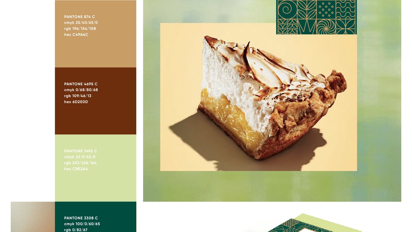В основе дизайна упаковки — орнамент, состоящий из графических изображений: пирожное, торт, вафли, пирожки, а также поварской колпак, корона и другие предметы и узоры, раскрывающие суть бренда. Фирменная гамма выполнена в аппетитных цветах — фисташковый, шоколадный, кремовый. Особую ценность упаковке придаёт малахитовый, который идеально контрастирует с золотом и выгодно оттеняет фисташковый оттенок.