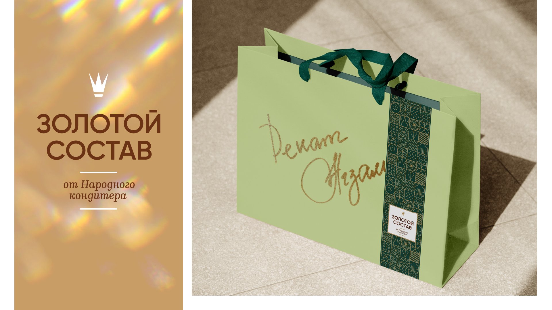 По словам Рената Агзамова, создателя «Народного кондитера» и новой марки «Золотой состав», сегодняшние покупатели всё чаще склонны расценивать торты и десерты как престижный подарок, который можно преподнести с гордостью. Поэтому и сами торты, и их оформление должны быть исключительно высокого качества. Мы разработали логотип и принципиальный дизайн упаковки для продукции бренда «Золотой состав», благодаря которым торты и десерты становятся настоящим ценным подарком.