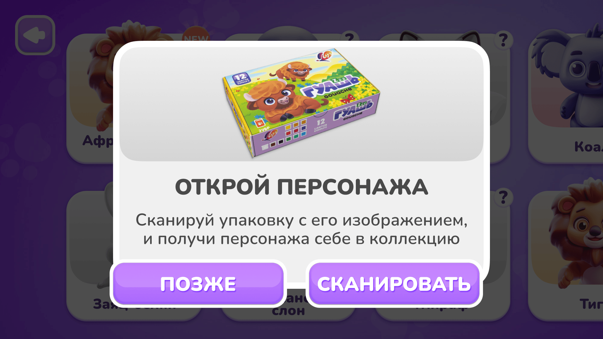 Далее пользователь может открыть новое животное, просканировав другую упаковку либо перейти в коллекцию, где есть режимы: