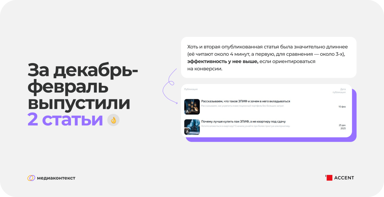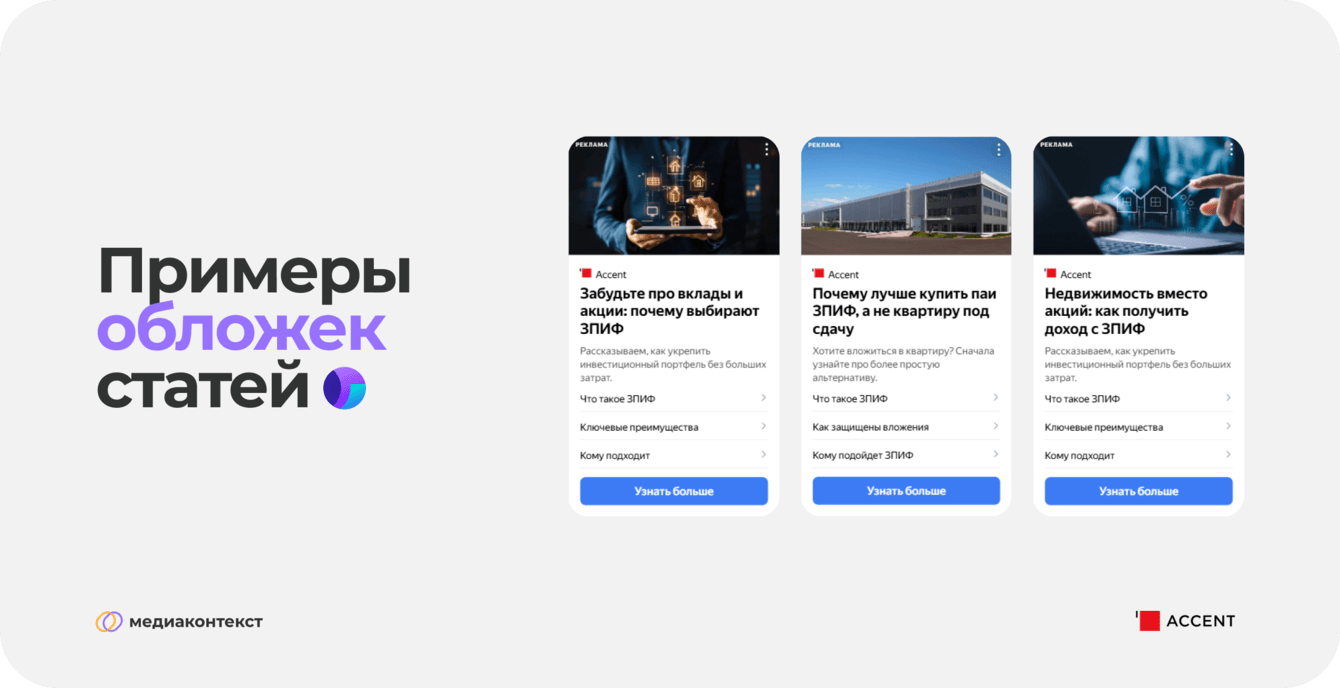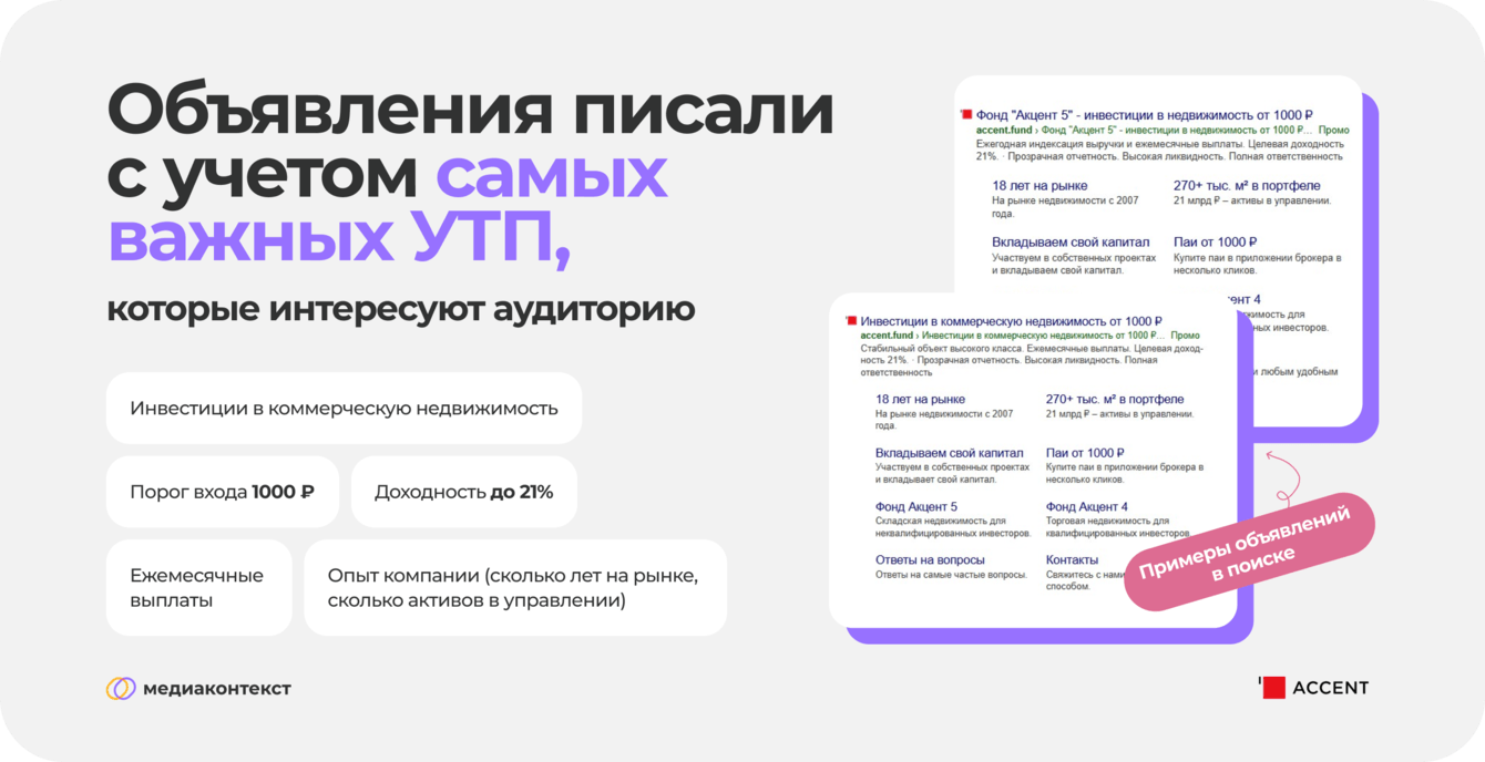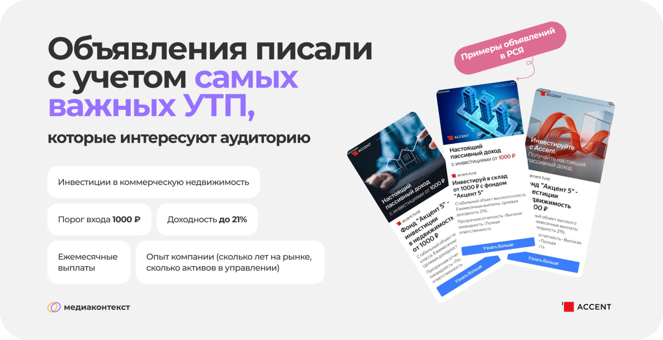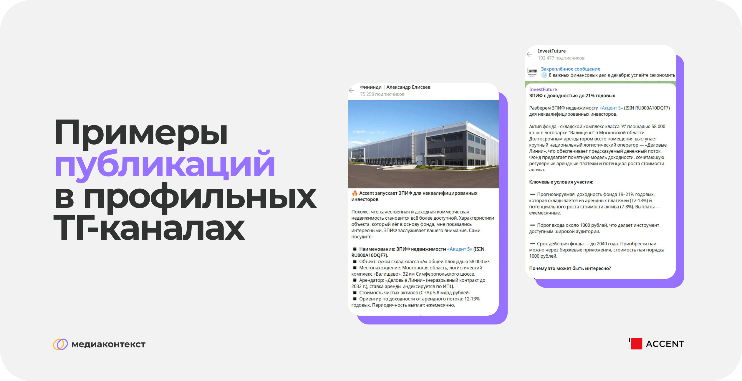 Accent – российская компания, оказывающая услуги управления инвестициями в коммерческую недвижимость институционального качества. Нам необходимо было продвигать определенный продукт, который только вышел на рынок – ЗПИФ недвижимости «Акцент 5».
