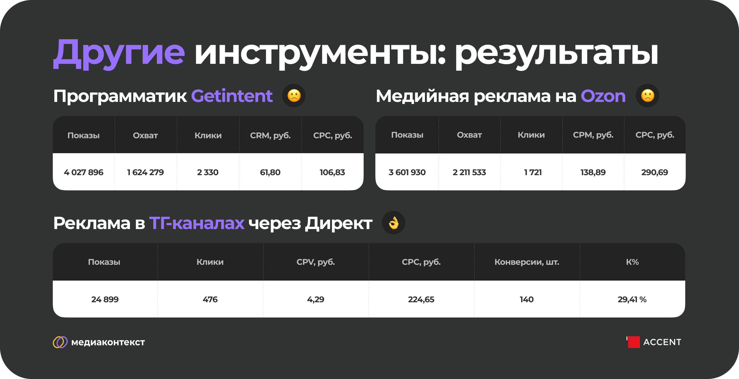 Инструмент был предложен клиентом. Мы в нем сомневались, так как таргетинги на Ozon не позволяют выбрать именно аудиторию тех, кто интересуется инвестициями. Максимум, что мы могли выбрать – это интерес к товарам определенных категорий (например, к премиум-сегменту). По итогу, к сожалению, тесты не показали хороших результатов. Рекламу остановили через пару недель.