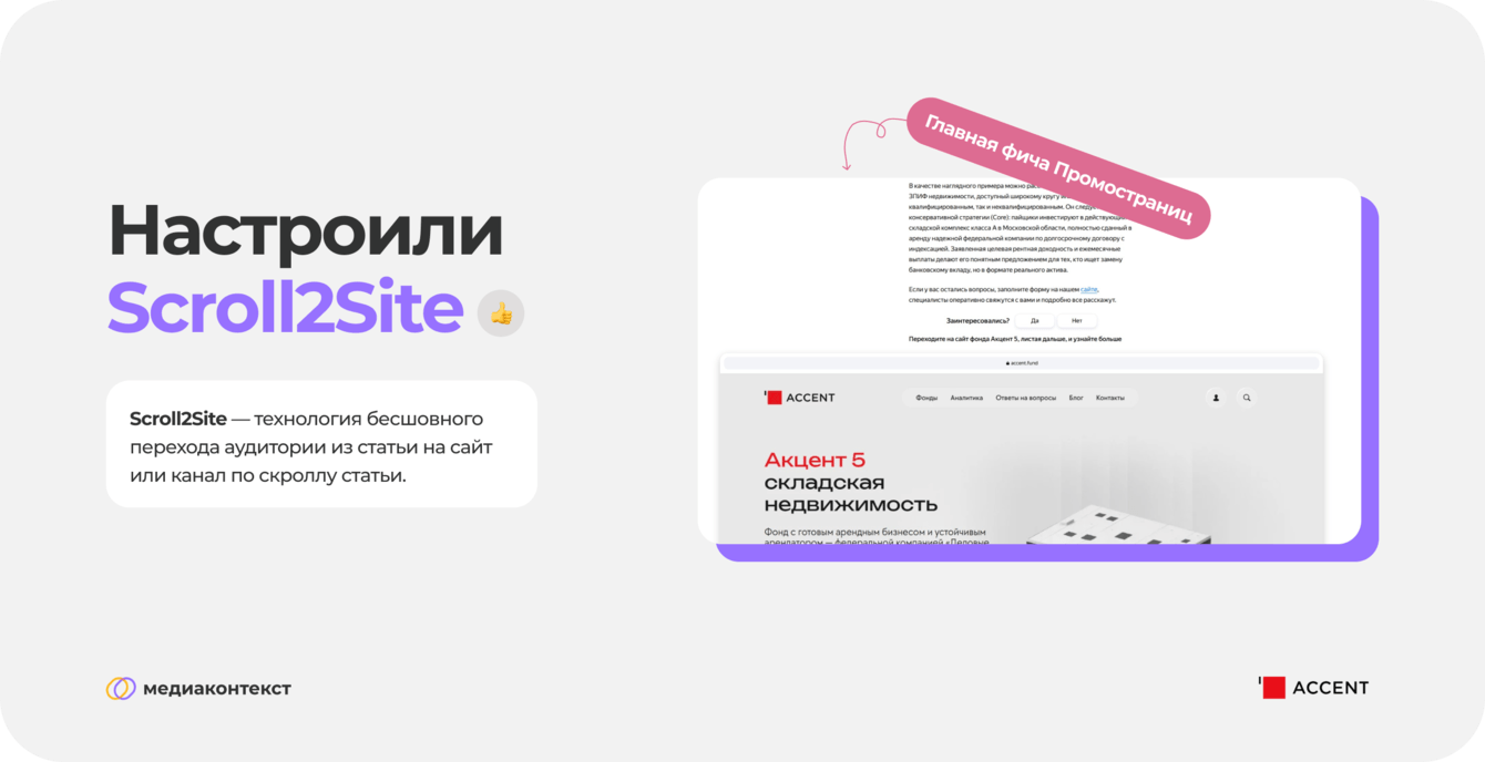 Не будем забывать про главную фичу ПромоСтраниц – Scroll2Site. Это бесшовный переход из статьи на сайт при пролистывании вниз. Так у аудитории становится меньше необходимых действий для того, чтобы попасть на сайт, что увеличивает количество переходов.