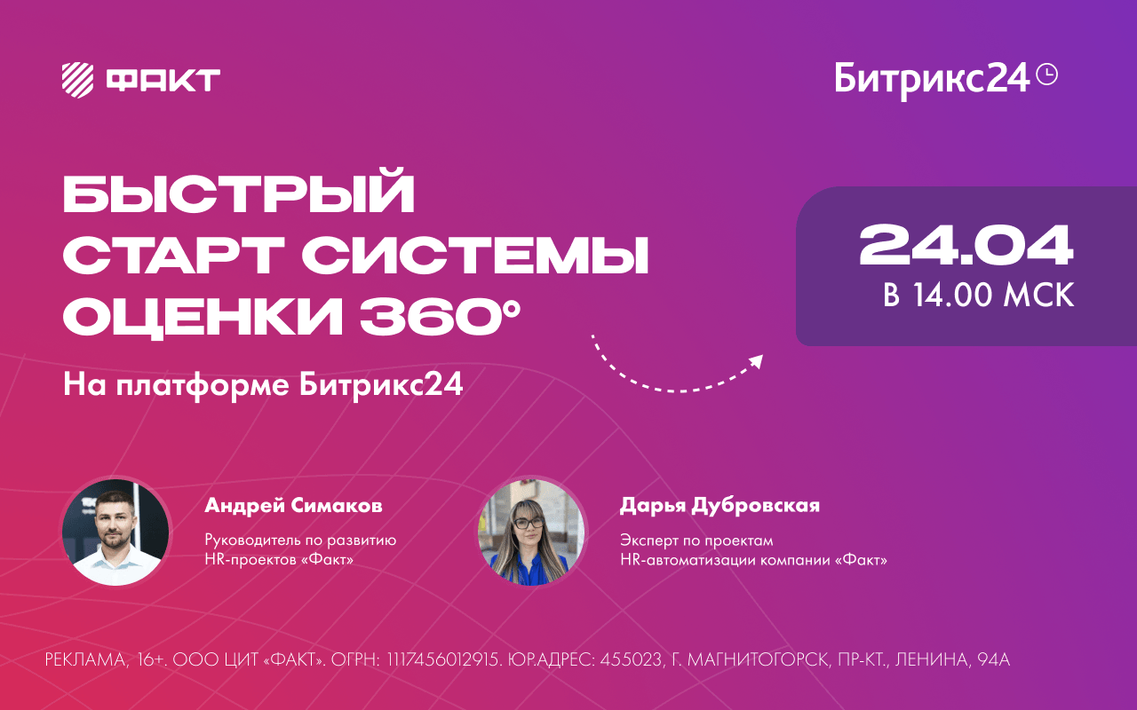 Приглашаем вас присоединиться к вебинару 24 апреля в 14:00 МСК., где мы детально разберем, как быстро и эффективно внедрить систему оценки 360° с помощью платформы Битрикс24 и автоматизировать сбор обратной связи.