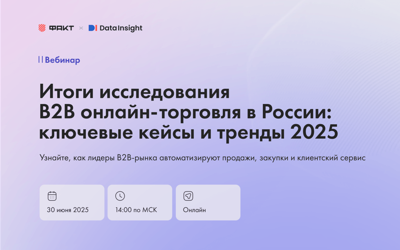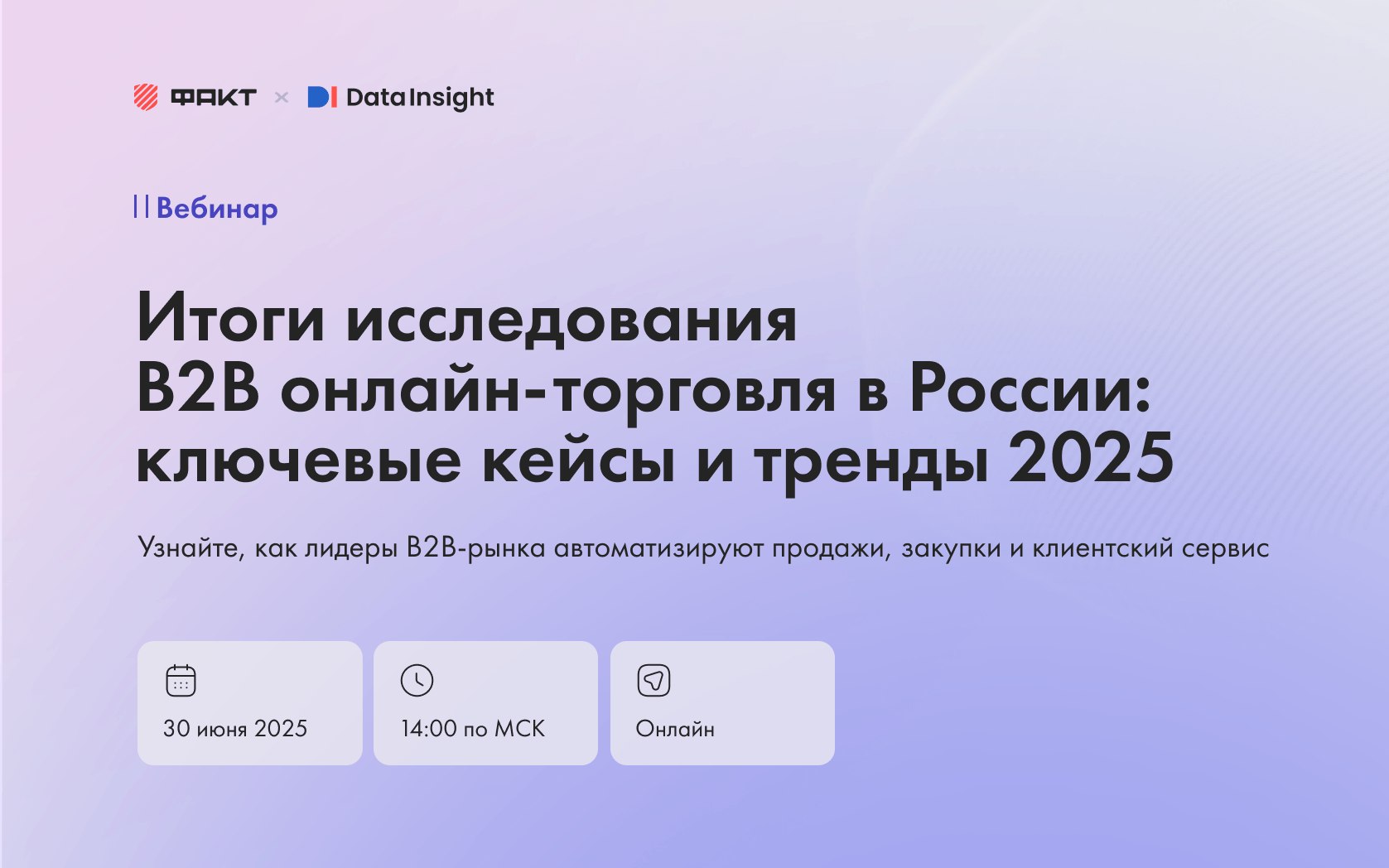30 июня в 14:00 (МСК) приглашаем на вебинар по новому исследованию от аналитического агентства Data Insight совместно с веб-интегратором «Факт»: «B2B онлайн-торговля в России: кейсы и тренды 2025».