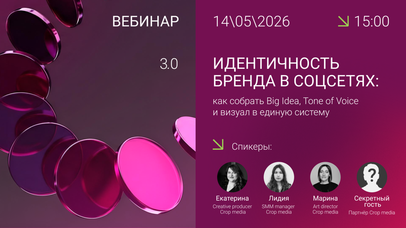 14 мая в 15:00 на третьем вебинаре серии SMM 360° разберём, как собрать Big Idea, Tone of Voice и айдентику в единую систему.
