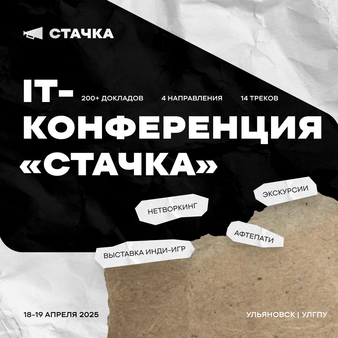 IT-конференция «Стачка» проводится с 2012 года. В 2025 году состоится дважды: 18-19 апреля в Ульяновске (УлГПУ), 2-3 октября в Питере (COSMOS Прибалтийская).