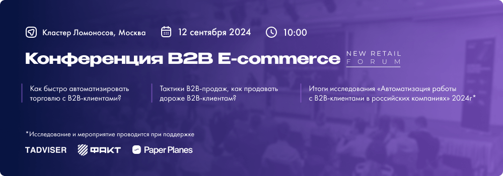 В рамках форума 12 сентября состоится конференция для производителей и дистрибьюторов B2B E-commerce New. На встрече будут представлены результаты исследования «Автоматизация торговли и партнерских взаимоотношений с B2B-клиентами», проведенное аналитическим центром TAdviser в партнерстве с веб-интегратором «Факт» и консалтинговым агентством Paper Planes.