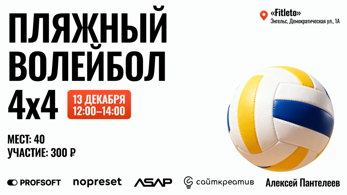 Мы трепетно искали площадку, и вот теперь нас будет ждать Fitleto на набережной Энгельса (клик по ссылке — там точка на картах) с кортом пляжного волейбола, судьей, настольным теннисом и награждением (это если мы наберем более 12 человек)!