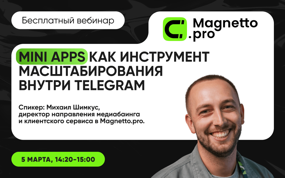Спикером выступит Михаил Шимкус, директор направления медиабаинга и клиентского сервиса Magnetto.pro. Эксперт в performance-маркетинге с более чем семилетним опытом расскажет, как брендам использовать Mini Apps для роста внутри Telegram без пропорционального увеличения рекламных бюджетов.