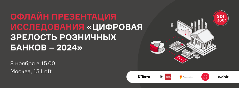 Агентство цифрового аудита SDI360 проводит презентацию для обсуждения итогов исследования «Цифровая зрелость розничных банков – 2024». Совместно с 7 компаниями-партнерами SDI360 оценили уровень цифровизации 35 розничных банков и составили рейтинги цифровой зрелости.
