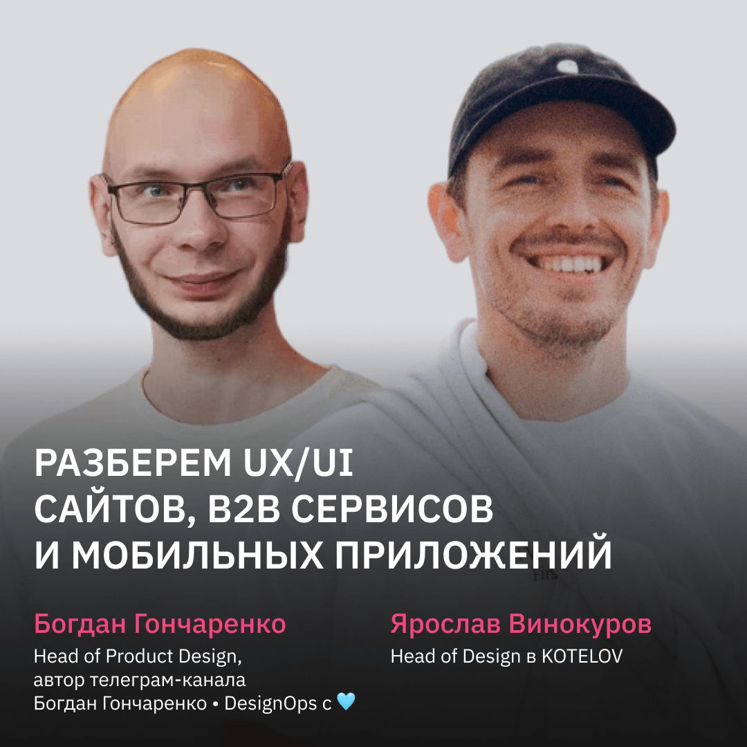 Ярослав Винокуров — Head of Design kotelov, работал над крутыми продуктами для Газпромбанк Лизинг, РЖД, Ламоды, Home Credit Bank и Богдан Гончаренко — легенда, Head of Product Design, автор канала Богдан Гончаренко • DesignOps с ❤️, расскажут про основные UX/UI ошибки в ваших цифровых продуктах, что надо изменить в первую очередь, дадут рекомендации по конкретному кейсу.