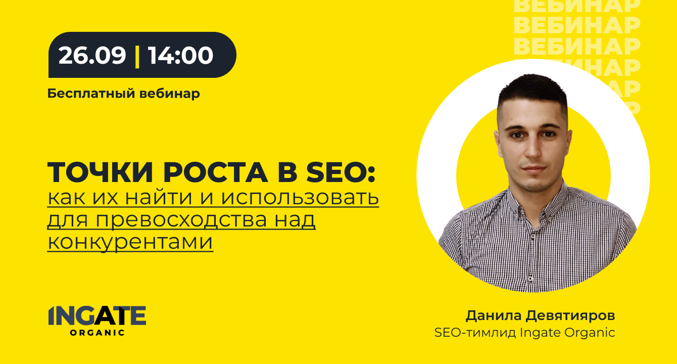 26 сентября в 14:00 по мск Данила Девятияров, SEO-тимлид Ingate Organic, расскажет, как, кого и зачем надо анализировать в поисковой выдаче, чтобы привлекать больше клиентов на сайт.