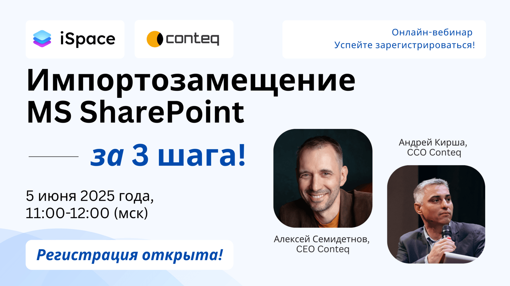 Приглашаем принять участие в вебинаре от компании Контек — золотого партнёра Microsoft с 15-летним стажем, который состоится онлайн, 5 июня в 11:00. На вебинаре мы покажем, как выбрать альтернативу Microsoft SharePoint и мигрировать на отечественное решение за 3 шага. Эксперты компании Conteq также рассмотрят функциональные возможности и преимущества iSpace – российского аналога MS SharePoint, платформы для совместной работы, автоматизации процессов и создания бизнес-приложений.