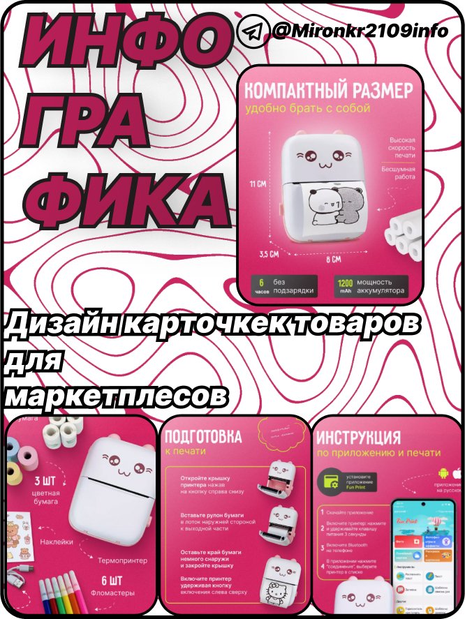 Привет! Я создаю продающие и визуально привлекательные карточки товаров для маркетплейсов (Wildberries, Ozon, Яндекс.Маркет и др.). Помогаю выделить ваш товар среди конкурентов, увеличить продажи и улучшить видимость.