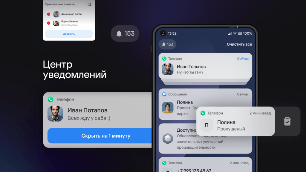 Мы поняли, что не все уведомления равны. Есть сообщения, которые можно прочитать позже, а есть такие, которые нельзя пропустить ни при каких условиях. В итоге мы выделили отдельный класс уведомлений: они визуально и звуково отличаются от остальных, не теряются среди сообщений от приложений или контактов, и пользователь не может случайно их проигнорировать или смахнуть. Он обязан на них отреагировать. Это может быть оповещение о пожарной тревоге, аварийной ситуации или срочный звонок от руководства.