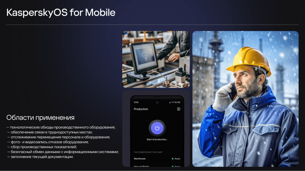 KasperskyOS Mobile создана для промышленных сценариев: технологические обходы, связь в труднодоступных местах, сбор данных на производстве