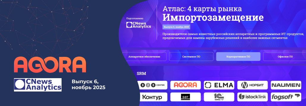 CNews обновил атлас российского IT-рынка «Импортозамещение 2025», сформировав сводный обзор ключевых отечественных решений в рамках национальной программы цифровой независимости. В новую версию включены отраслевые решения, ориентированные на цифровизацию закупочной деятельности и управление взаимоотношениями с поставщиками. AGORA попала в категорию «Корпоративное ПО — SRM-решения», что демонстрирует признание нашей платформы как одного из ведущих инструментов для стратегической закупочной деятельности на локальном рынке.