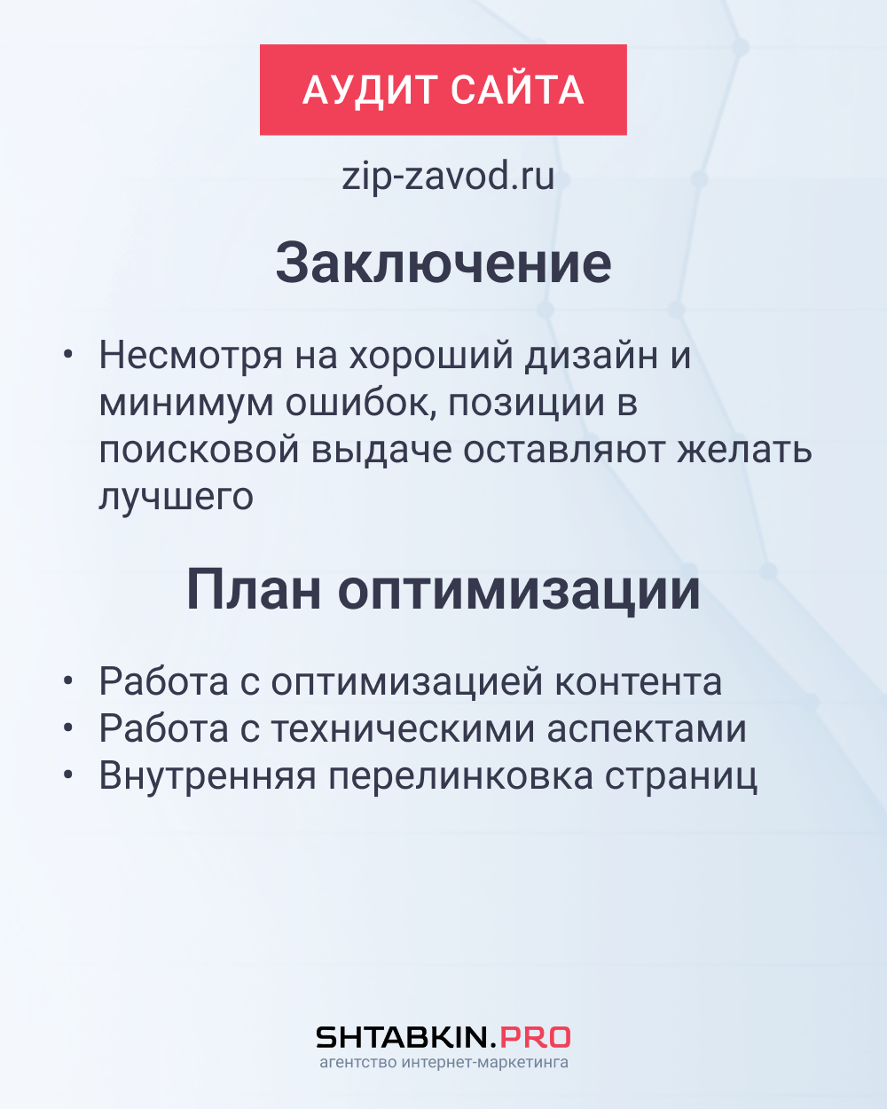 Проведенный SEO-аудит выявил ряд областей, которые требуют улучшения. Несмотря на хороший дизайн сайта, его текущие позиции в поисковой выдаче оставляют желать лучшего. Необходима комплексная работа по оптимизации контента, технических аспектов и улучшению внутренней перелинковки.