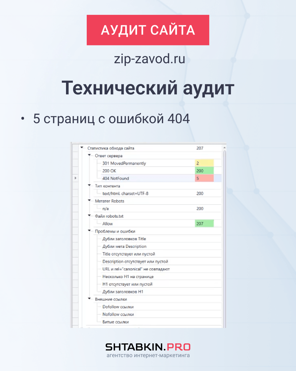 Технический аудит выявил 5 ссылок, ведущие на несуществующие страницы (ошибка 404)