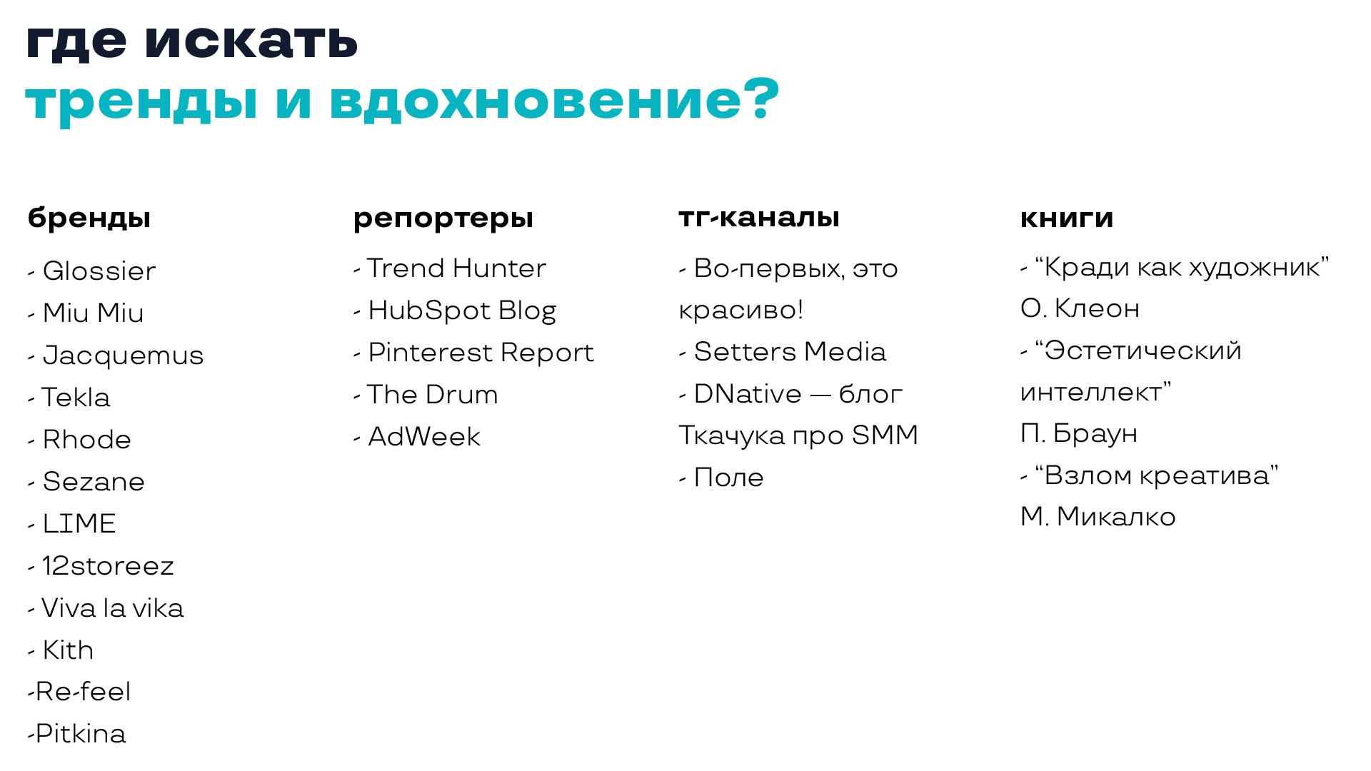 Искать вдохновение для идей можно повсюду: путешествия, встречи с друзьями, прогулка, хобби, работа. Любой опыт можно использовать для реализации креативной задумки. Предлагаем несколько полезных источников для насмотренности и погружения в тему креативности.
