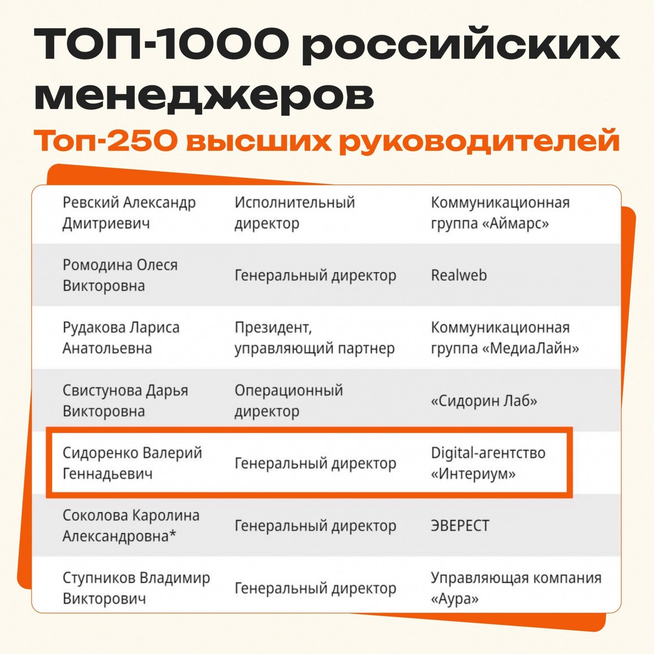 Интериум также от души поздравляет с вхождением в рейтинг Игоря Писарского, председателя совета директоров коммуникационного агентства Р.И.М., сотрудники которого являются нашими друзьями!
